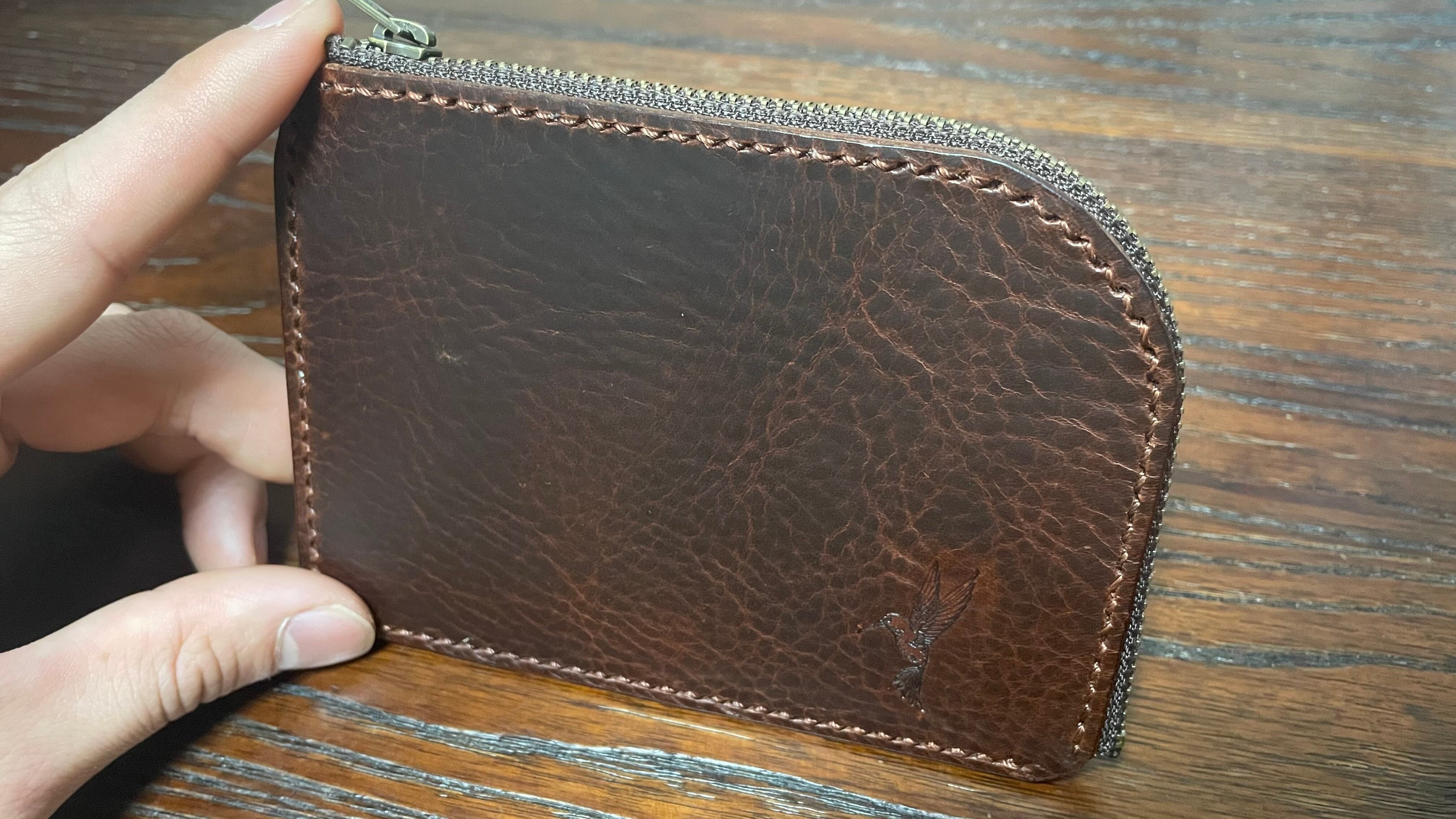 ダークブラウンの革に茶色のステッチで縫い上げたL字ファスナーウォレット。シボ(革本来のシワ)がいい味出してます。