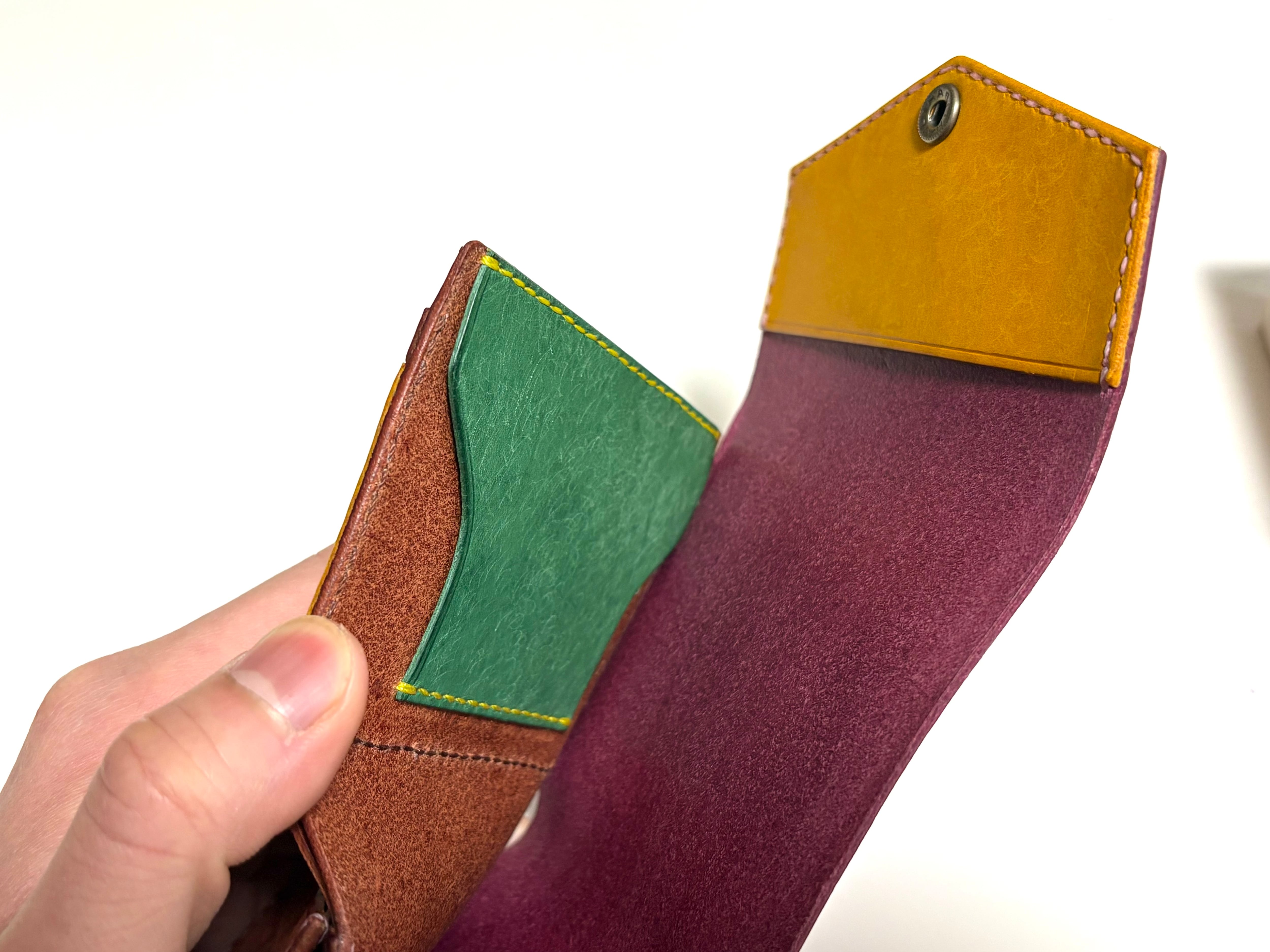 外見はシンプル。中身は個性的で、さらに開くとまた違う表情を見せてくれる。遊び心を忘れない。そんな財布を作りました。人としてもそうでありたいですね